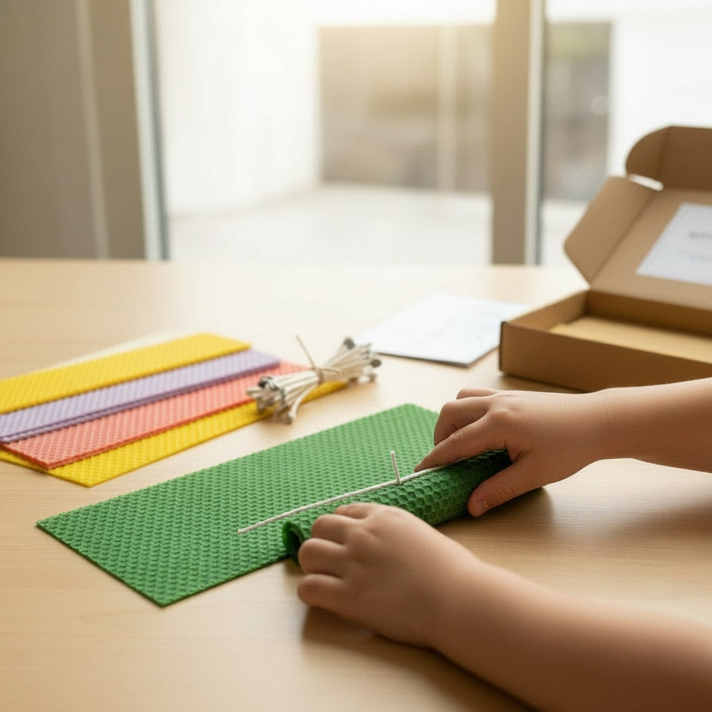 Keywords: Rolled beeswax candle kit, no-melt candle, fireless crafting, children's DIY kit, colored beeswax sheets, honeycomb foundation, natural honey scent, quick craft gift.